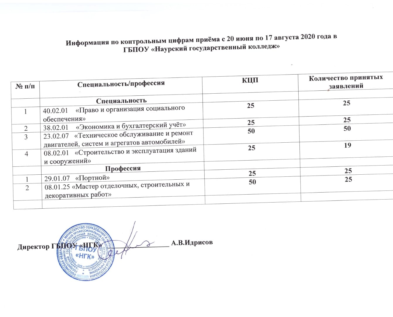 Информация по контрольным цифрам приёма с 20 июня по августа 2020 года в ГБПОУ "Наурский государственный колледж"