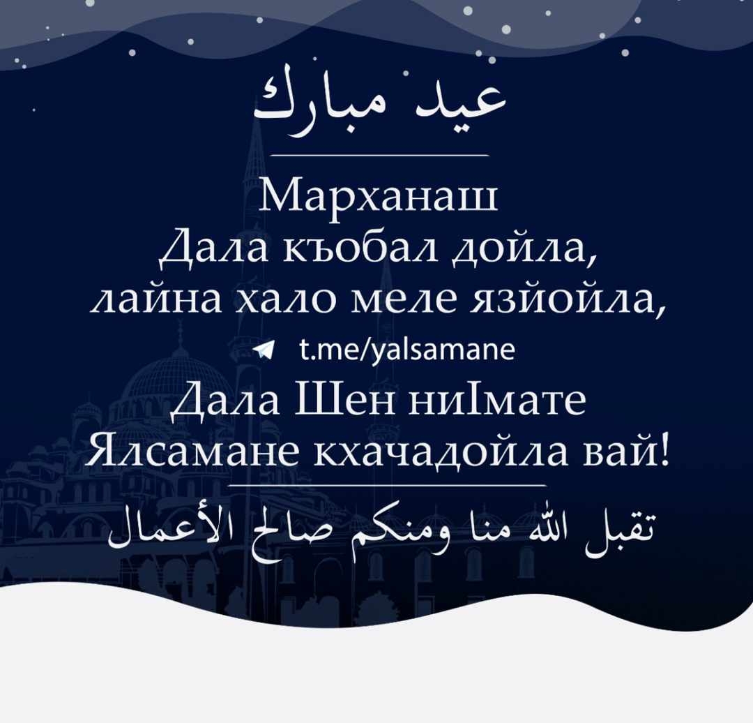 Мархнаш Аллах1 Дала къобал дойла! Лайна хало Везчу Дала меле яз йойла! Т1ейог1учу ханна мархнаш кхаба а,даста а могшалла лойла, иштта: ирсе дахар,дуьненан аьтто,иман,ислам,гергарчера безам,неха лерам,ДЕЛЕРА къинхетам хуьлила! Дала х1ара мархи бутта бахьна долуш ялсаманчохь 1ар-дахар лойла вайна. И Веза Дела дукха везна, цу Далла дукха дезначу тобанах дойла вай!!!!
